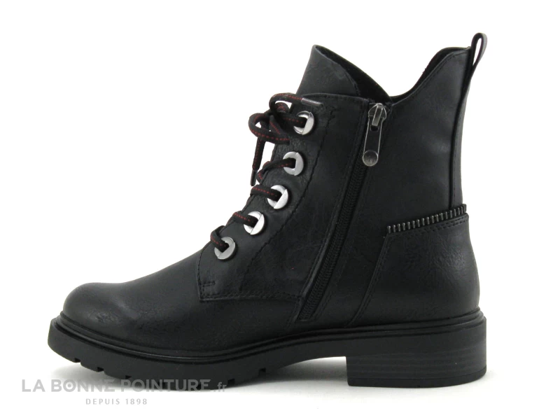Les 5 oeillets fantaisie ajoutent de l’originalité à la bottine Marco Tozzi, traversés par un lacet bicolore rouge et noir.